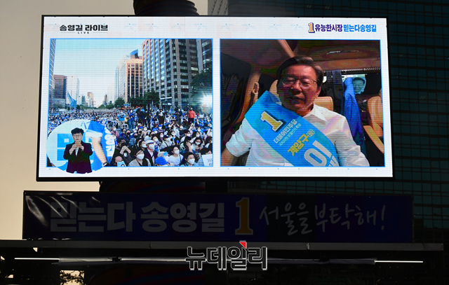 [포토] 화상으로 송영길 후보 유세장에 등장한 이재명 선대위원장