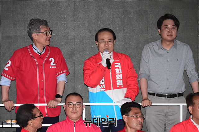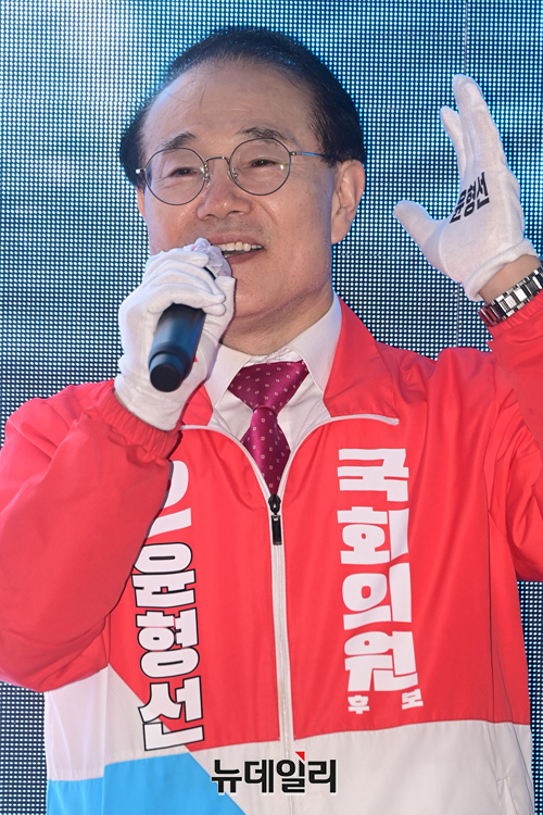 윤형선 국민의힘 인천 계양을 국회의원 후보가 26일 오후 인천 계양구청 앞에서 열린 유세에서 지지호소를 하고 있다. (인천=강민석 기자)