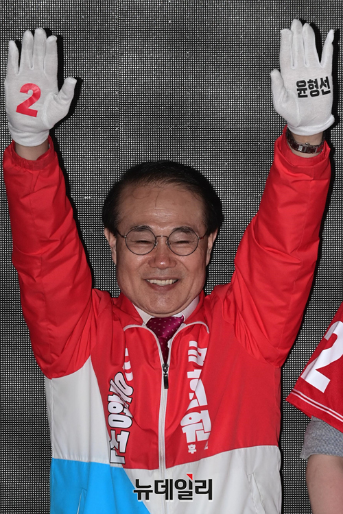 윤형선 국민의힘 인천 계양을 국회의원 후보가 26일 오후 인천 계양구청 인근 먹자골목에서 지지호소를 하고 있다. (인천=강민석 기자)