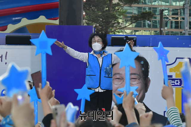 더불어민주당 소속 김진애 전 의원이 24일 서울 중구 청계광장에서 열린 송영길 더불어민주당 서울시장 후보 합동유세에서 지지연설을 하고 있다.