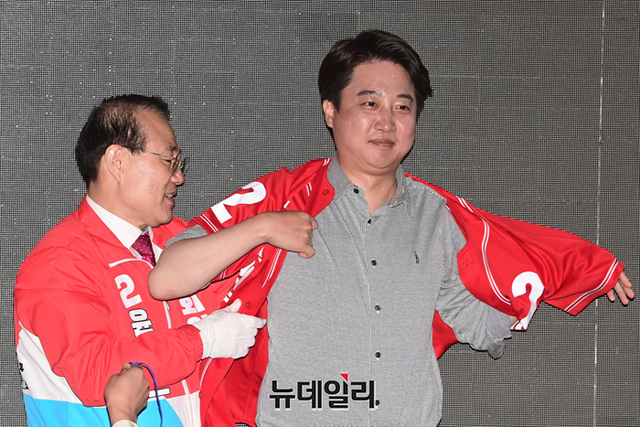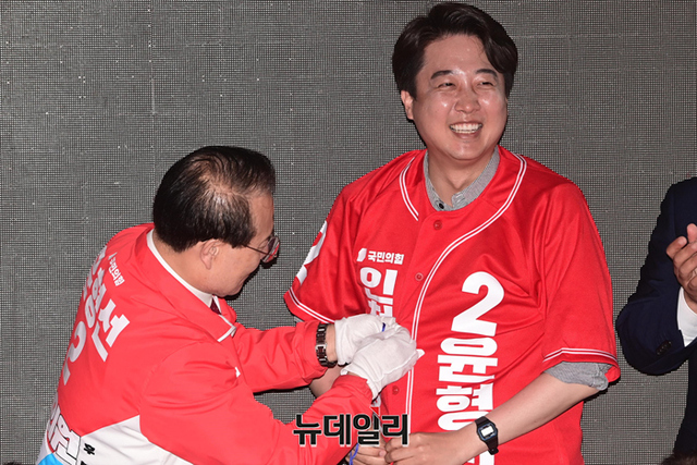 이준석 국민의힘 대표와 윤형선 인천 계양을 국회의원 후보가 26일 오후 인천 계양구청에서 열린 유세에서 만나 악수를 나누고 있다. (인천=강민석 기자)