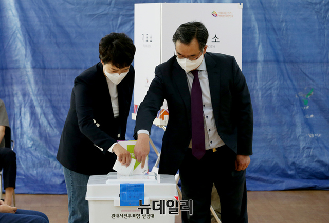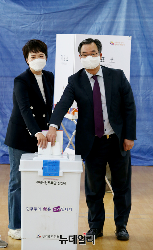김은혜 국민의힘 경기지사 후보와 배우자 유형동 변호사가 사전투표 시작일인 27일 오전 경기 성남시 운중동 행정복지센터에서 투표를 하고 있다. (사진=김은혜 캠프)