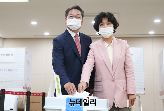 [포토] 유정복 인천시장 후보, 부인과 함께 사전투표