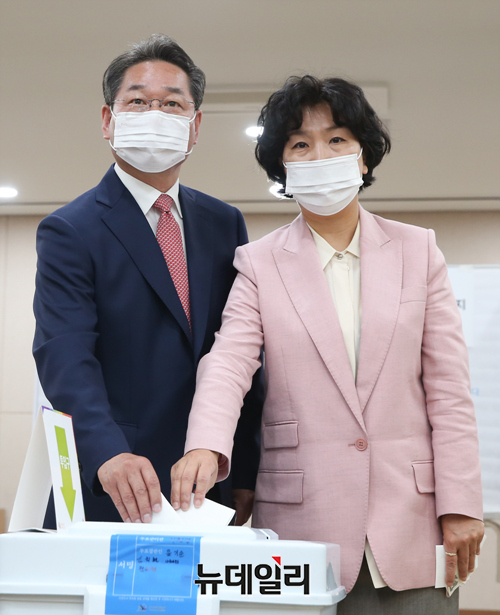 유정복 국민의힘 인천시장 후보와 부인 최은영 씨가 사전투표 시작된 27일 오전 인천 남동구 논현1동 행정복지센터에서 투표를 하고 있다. (사진=유정복 캠프)