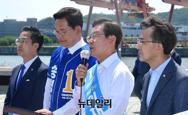 인천 계양을 국회의원 보궐선거에 출마한 이재명 더불어민주당 상임고문이 27일 오전 경기 김포시 아라마린센터 공원에서 열린 '수도권 서부 대개발을 위한 정책협약 기자회견'에서 발언을 하고 있다.