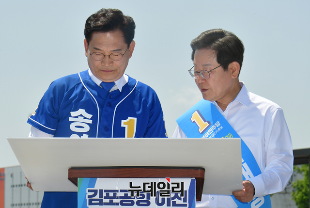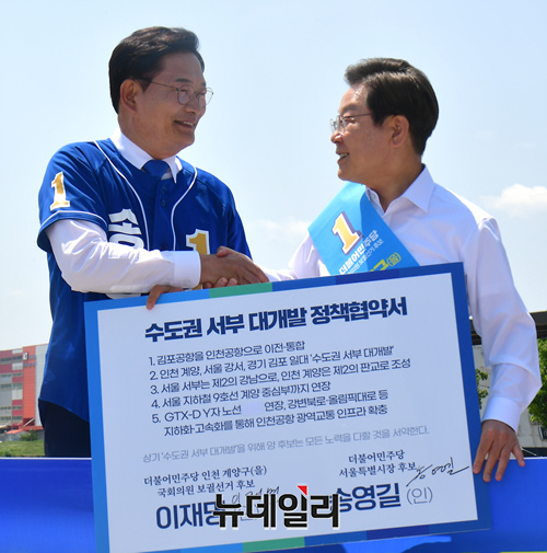 인천 계양을 국회의원 보궐선거에 출마한 이재명 더불어민주당 상임고문과 송영길 서울시장 후보가 27일 오전 경기 김포시 아라마린센터 공원에서 열린 '수도권 서부 대개발을 위한 정책협약 기자회견'에서 협약서를 들어 보이고 있다.