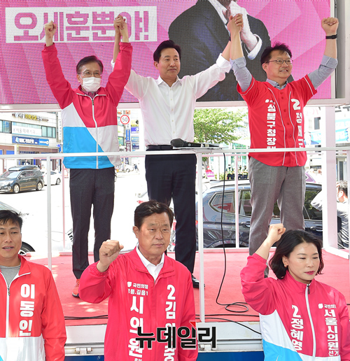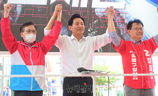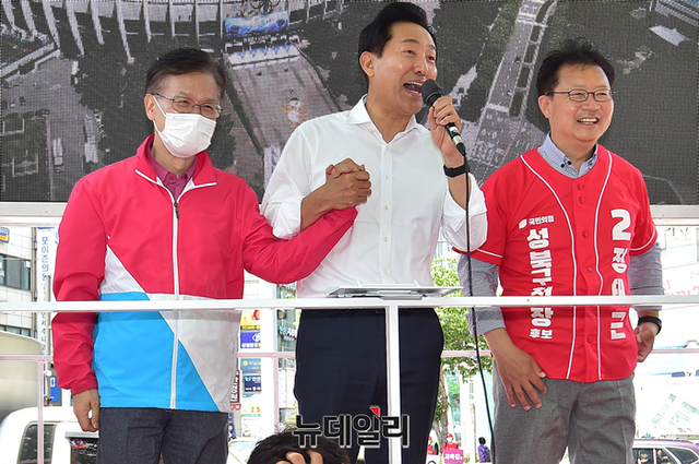 오세훈 국민의힘 서울시장 후보가 사전투표가 시작된 27일 오후 서울 성북구 성신여대 입구에서 열린 합동유세에서 정태근 성북구청장 후보와 한상학 당협위원장과 함께 손을 잡고 지지호소를 하고 있다.