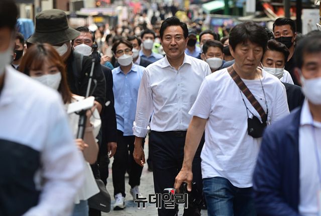 오세훈 국민의힘 서울시장 후보가 사전투표가 시작된 27일 오후 서울 성북구 성신여대 입구에서 열린 합동유세에 지지자들의 환호를 받으며 입장하고 있다.