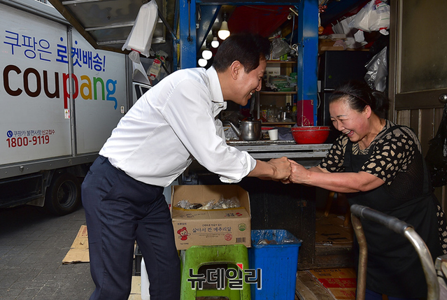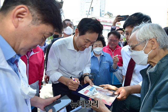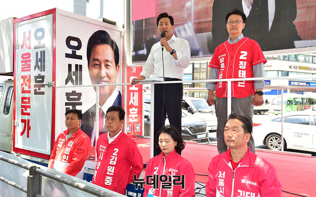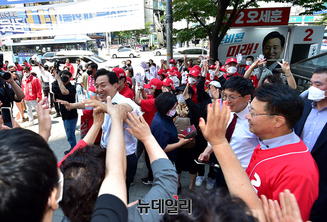 [포토] 환호 받으며 유세장 입장하는 오세훈 서울시장 후보