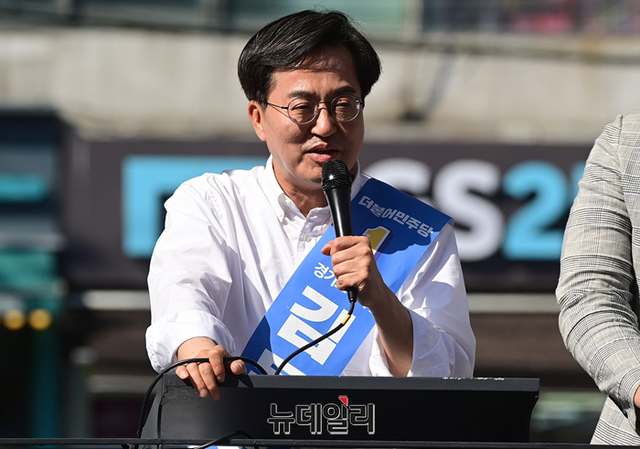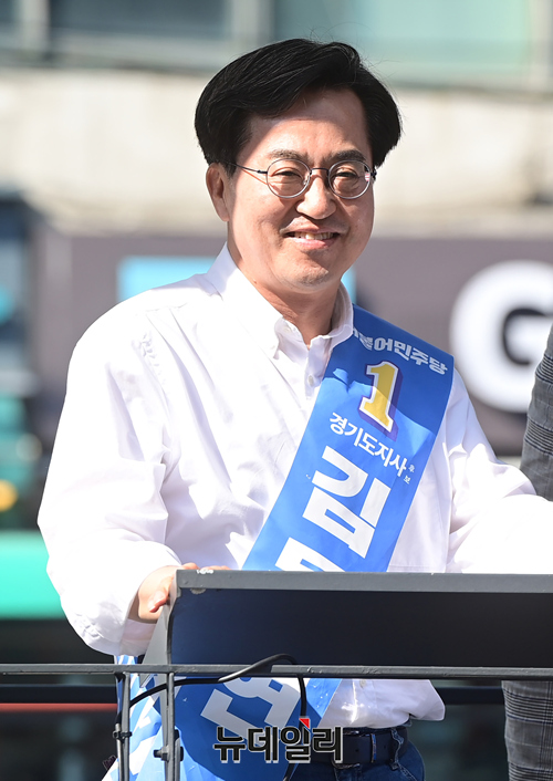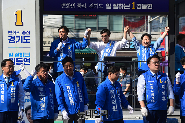 김동연 더불어민주당 경기지사 후보가 27일 오후 경기 시흥시 삼미시장에서 열린 합동유세에서 임병택 시흥시장 후보와 지지호소를 하고 있다. (경기 시흥=정상윤 기자)