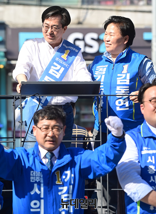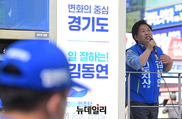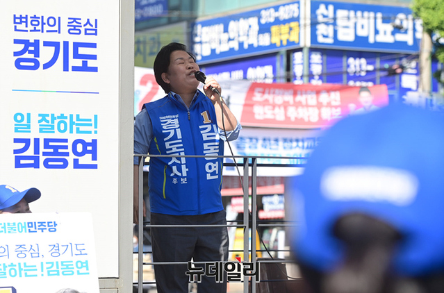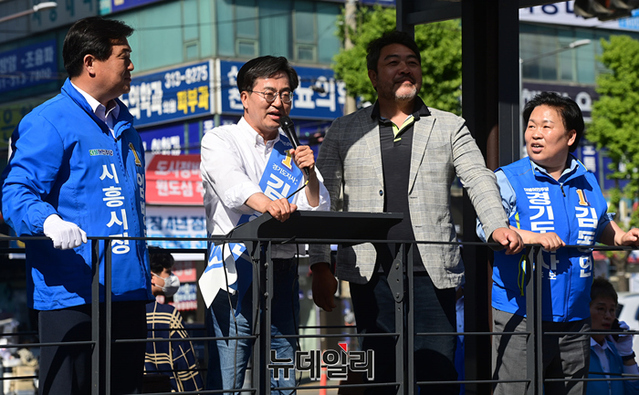 문정복 더불어민주당 의원이 27일 오후 경기 시흥시 삼미시장에서 열린 김동연 더불어민주당 경기지사 후보 합동유세에서 지지호소를 하고 있다. 이날 유세엔 김 후보, 임병택 시흥시장 후보, 문정복 의원, 배우 이원종이 함께 했다. (경기 시흥=정상윤 기자)