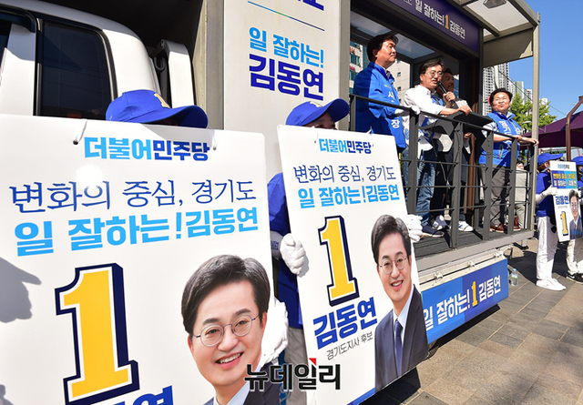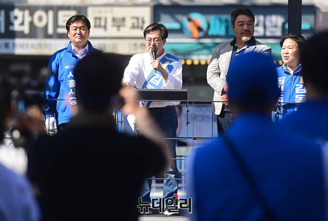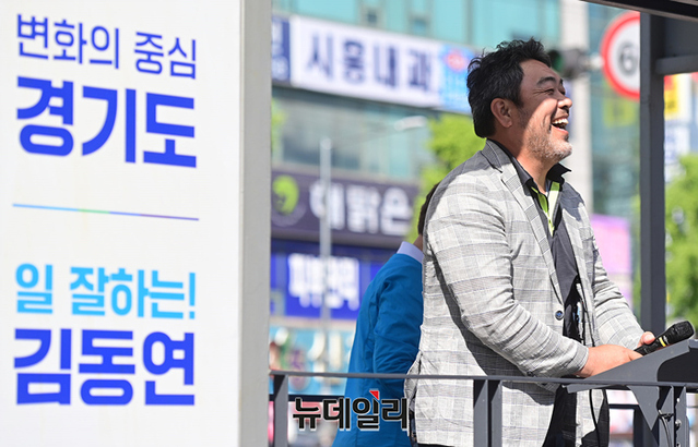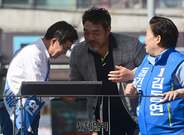 김동연 더불어민주당 경기지사 후보가 27일 오후 경기 시흥시 삼미시장에서 열린 합동유세에서 지원 나선 배우 이원종과 만나 악수를 나누고 있다. (경기 시흥=정상윤 기자)