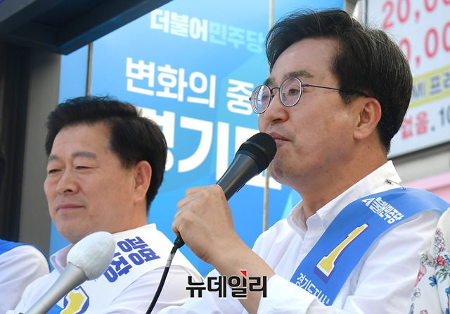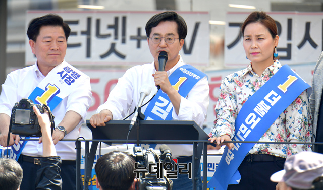 김동연 더불어민주당 경기도지사 후보가 27일 오후 경기 광명전통시장 집중유세에서 시민들에게 지지를 호소하고 있다.