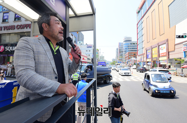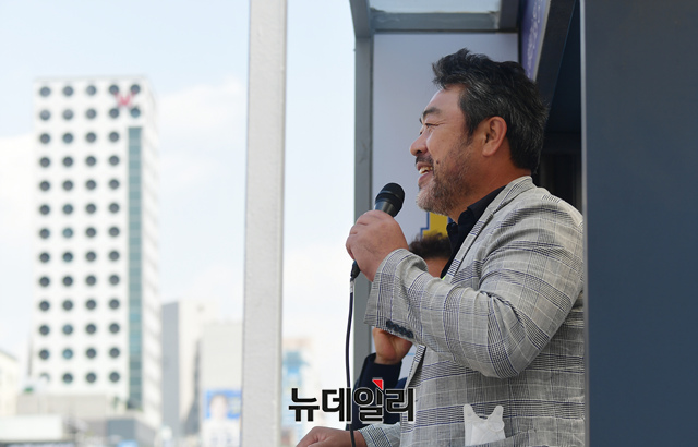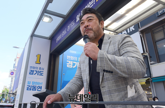 배우 이원종이 27일 오후 경기 광명전통시장에서 열린 김동연 더불어민주당 경기도지사 후보 집중유세에서 시민들에게 지지를 호소하고 있다.