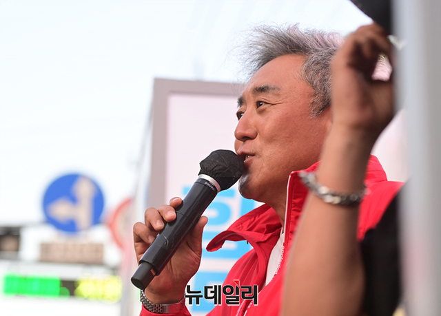 배우 최준용이 사전투표 첫 날인 27일 오후 경기 성남중앙시장에서 열린 합동유세장에서 지지호소를 하고있다. 유세엔 김은혜 국민의힘 경기지사 후보, 안철수 분당갑 국회의원 후보, 신상진 성남시장 후보가 함께 참석했다. (경기 성남=정상윤 기자)