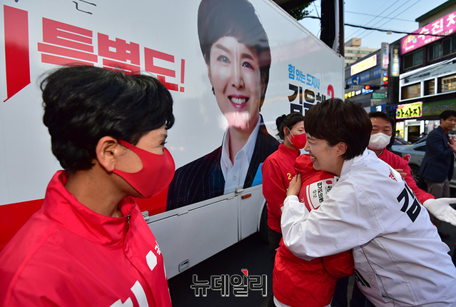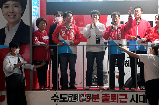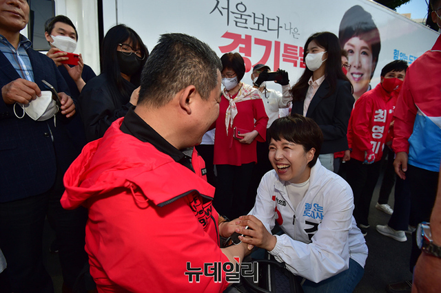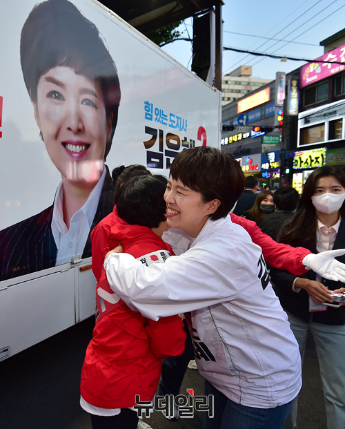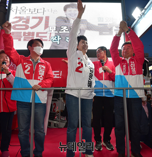 김은혜 국민의힘 경기지사 후보가 사전투표 첫 날인 27일 오후 경기 성남중앙시장에서 열린 합동유세장에 입장하며 시·구의원 후보들과 인사를 나누고 있다. 유세엔 김은혜 국민의힘 경기지사 후보, 안철수 분당갑 국회의원 후보, 신상진 성남시장 후보가 함께 참석했다. (경기 성남=정상윤 기자)