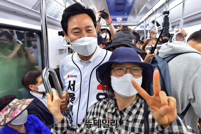 오세훈 국민의힘 서울시장 후보가 28일 오후 서울 관악구에 개통된 경전철 신림선에서 시민과 대화를 나누고 있다.