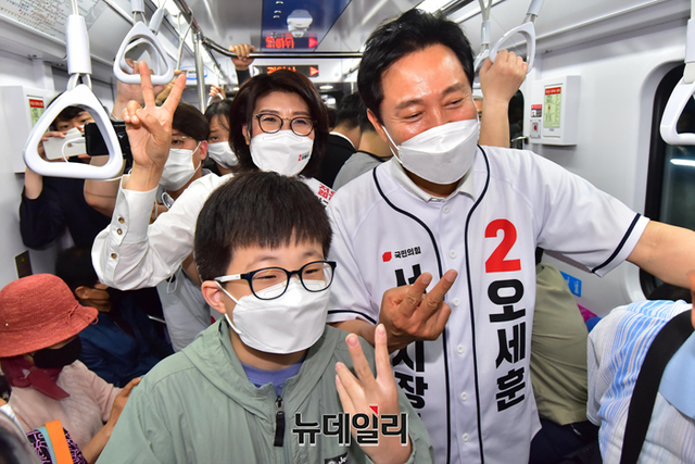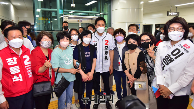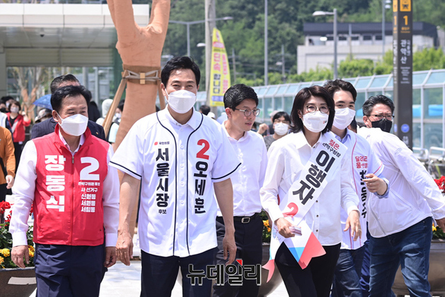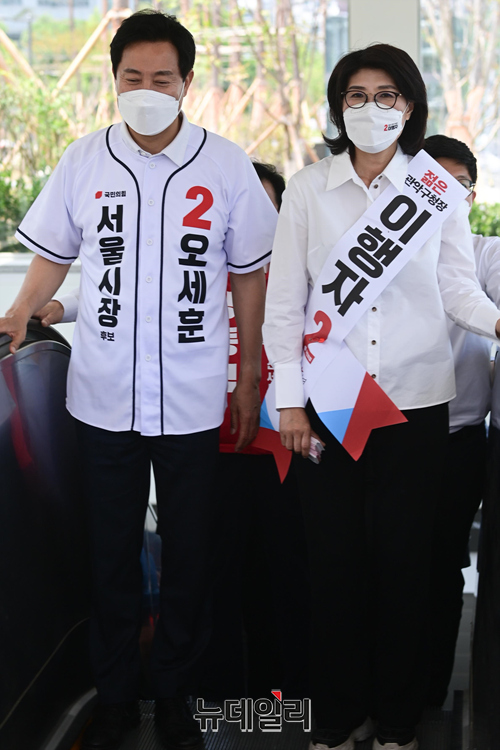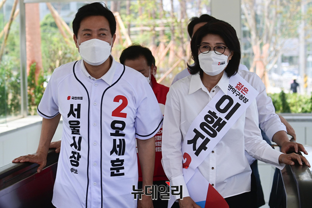 오세훈 국민의힘 서울시장 후보와 이행자 관악구청장 후보가 28일 오후 서울 관악구에 개통된 경전철 신림선 관악산역에서 지지호소를 하고 있다.