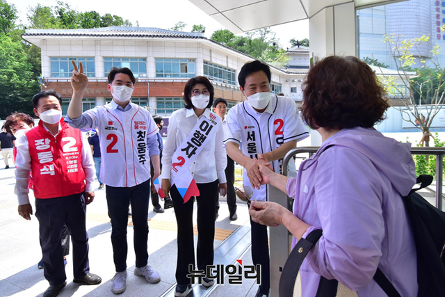 [포토] 관악산역 찾은 오세훈·이행자 후보