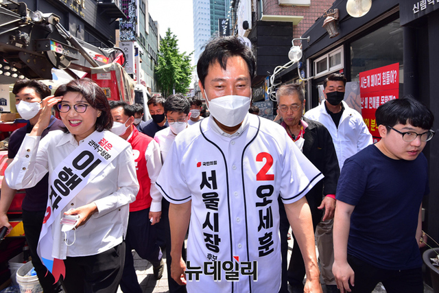 오세훈 국민의힘 서울시장 후보와 이행자 관악구청장 후보가 28일 오후 서울 관악구 도림천에서 만나 개통된 경전철 신림선을 탑승하기 위해 이동하고 있다.