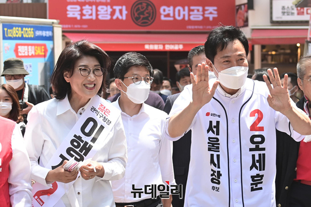 [포토] 신림선으로 이동하는 오세훈·이행자 후보