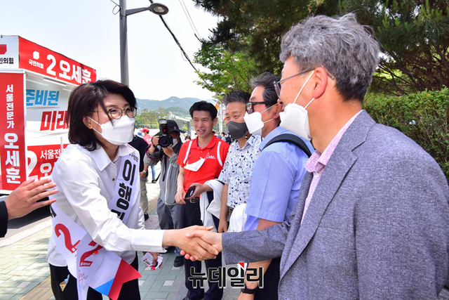 이행자 국민의힘 관악구청장 후보가 28일 오후 서울 관악구에 개통된 경전철 신림선에서 시민들과 대화를 나누고 있다.
