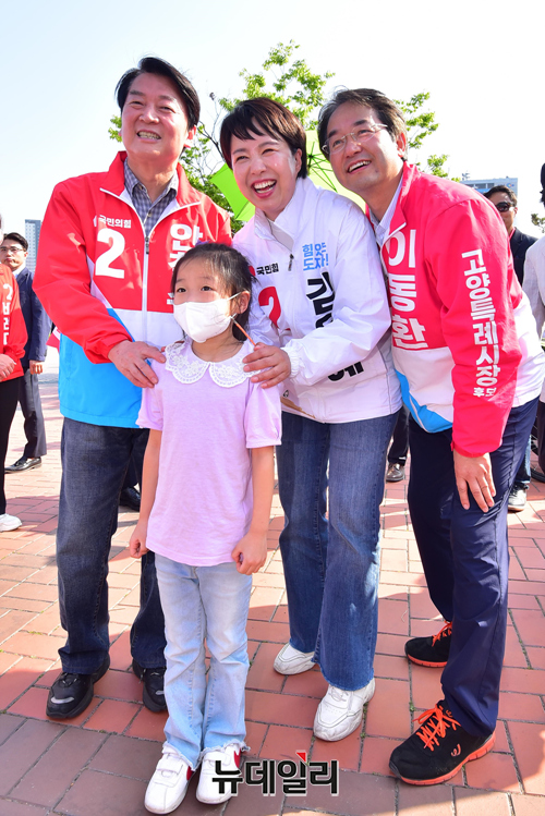 김은혜 국민의힘 경기지사 후보(왼쪽부터), 안철수 분당갑 국회의원 후보, 이동환 고양시장 후보가 28일 오후 경기 고양시 노래하는분수대에서 열린 합동유세에서 손을 잡고 기념 기념촬영을 하고 있다. (경기 고양=강민석 기자)