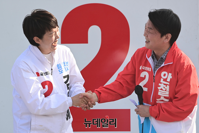 김은혜 국민의힘 경기지사 후보(왼쪽), 안철수 분당갑 국회의원 후보가 28일 오후 경기 고양시 노래하는분수대에서 열린 유세에서 만나 손을 잡으며 인사를 하고 있다. (경기 고양=강민석 기자)