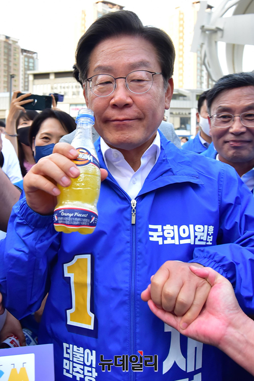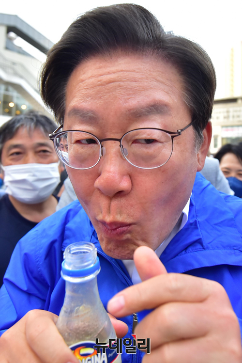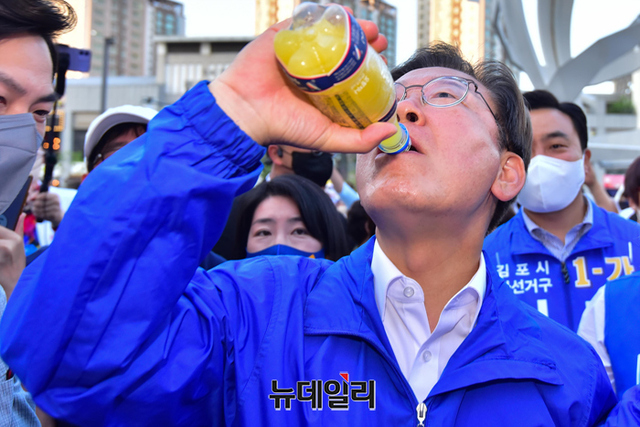 이재명 더불어민주당 인천 계양을 국회의원 보궐선거 후보가 28일 오후 경기 김포시 라베니체 수변공원에서 열린 정하영 김포시장 후보의 유세에서 지지자가 준비한 음료수를 마시고 있다. (경기 김포=강민석 기자)