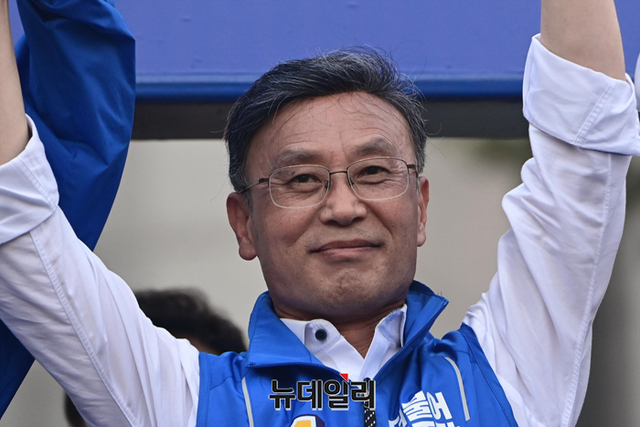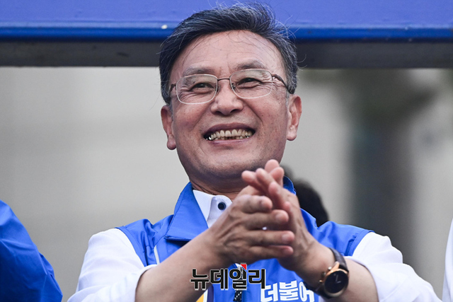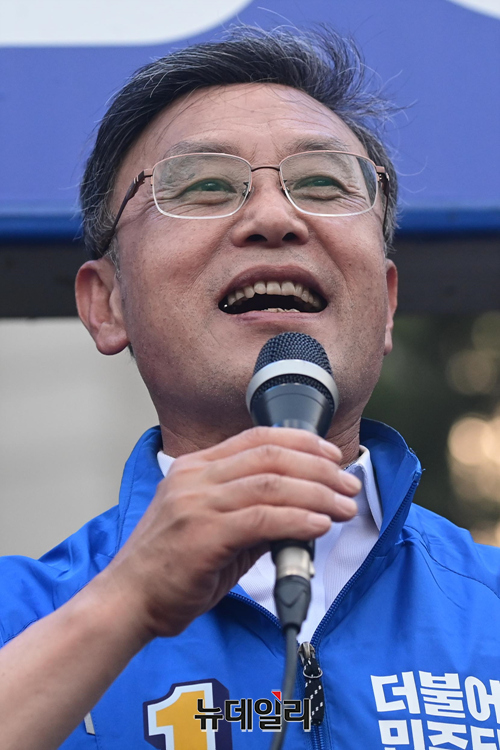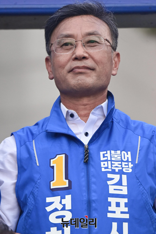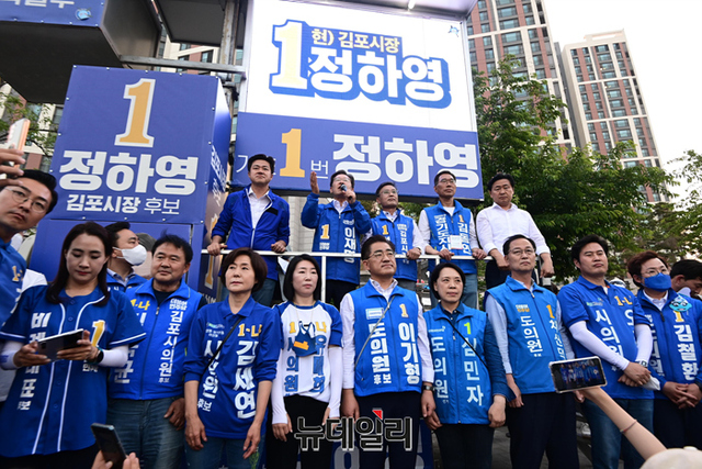 정하영 더불어민주당 김포시장 후보가 28일 오후 경기 김포시 라베니체 수변공원에서 열린 유세에서 지지호소를 하고 있다. (경기 김포=강민석 기자)