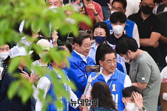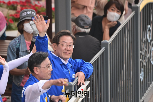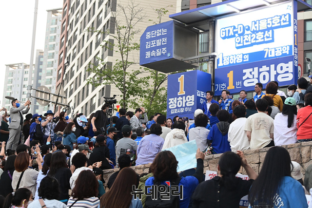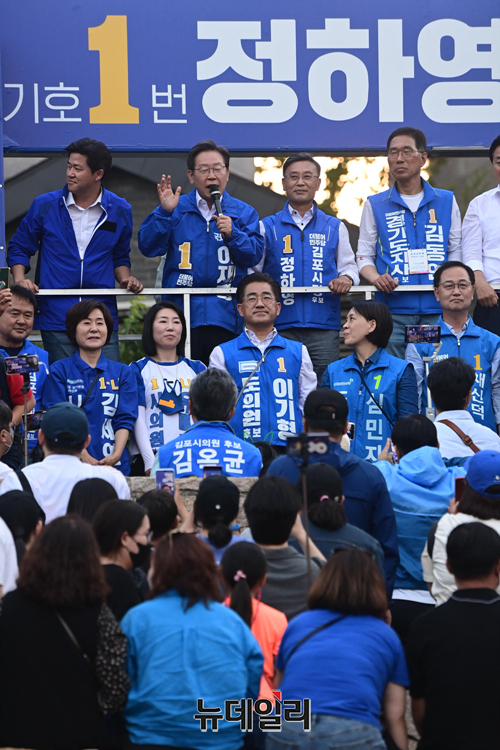 이재명 더불어민주당 인천 계양을 국회의원 보궐선거 후보와 정하영 김포시장 후보가 28일 오후 경기 김포시 라베니체 수변공원에서 열린 유세에서 지지호소를 하고 있다. (경기 김포=강민석 기자)