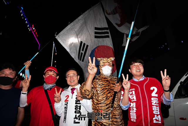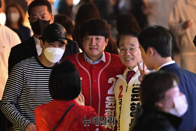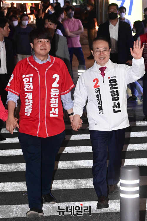 이준석 국민의힘 대표와 윤형선 인천 계양을 국회의원 보궐선거 후보가 28일 오후 인천 계양구청 건너편에서 열린 유세를 위해 이동하고 있다. (인천=강민석 기자)