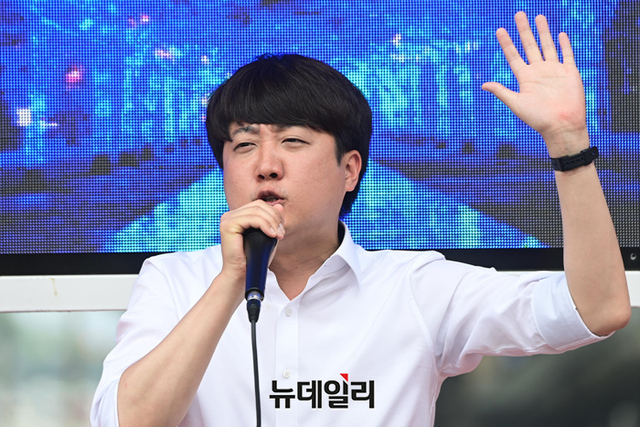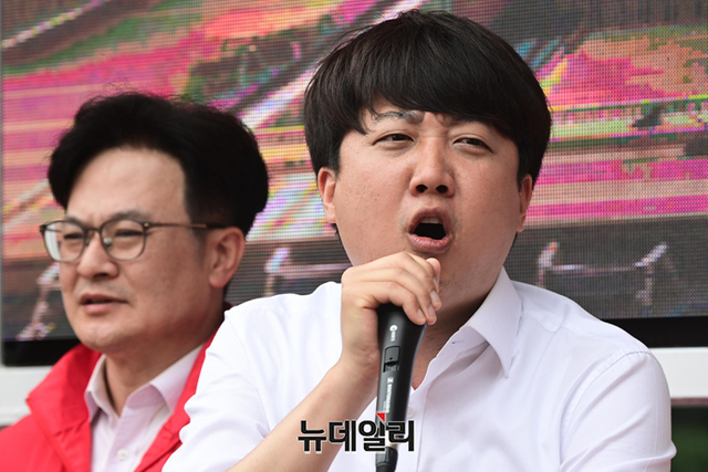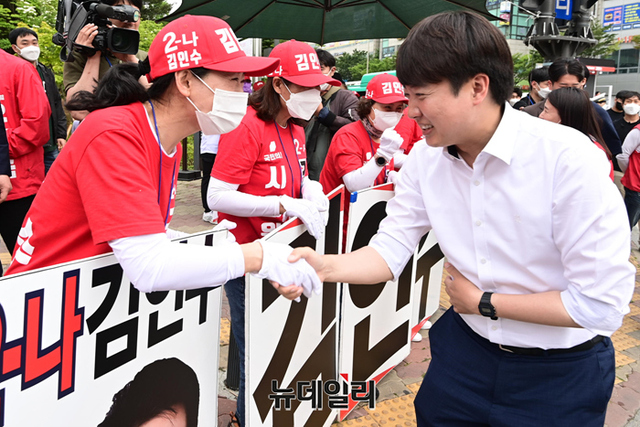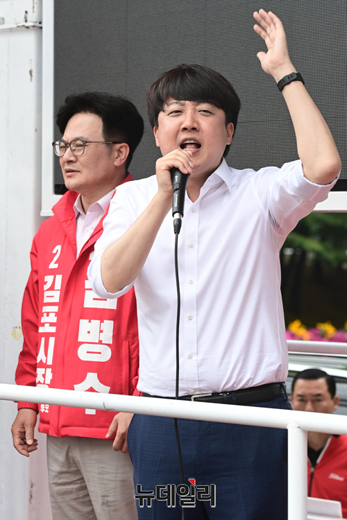 이준석 국민의힘 대표가 29일 오후 경기 김포시 사우역에서 열린 김병수 김포시장 후보의 유세에서 지지호소를 하고 있다. (경기 김포=강민석 기자)