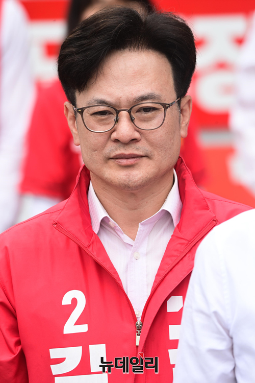 김병수 국민의힘 김포시장 후보가 29일 오후 경기 김포골드라인 사우역에서 열린 유세에서 지지호소를 하고 있다. (경기 김포=강민석 기자)