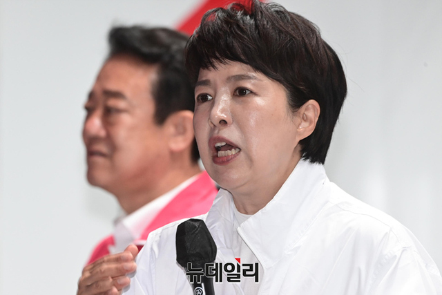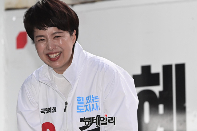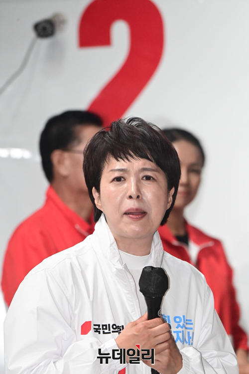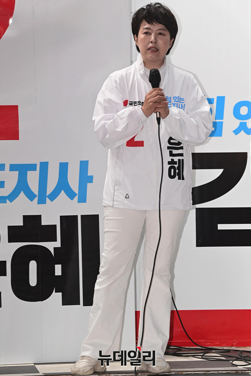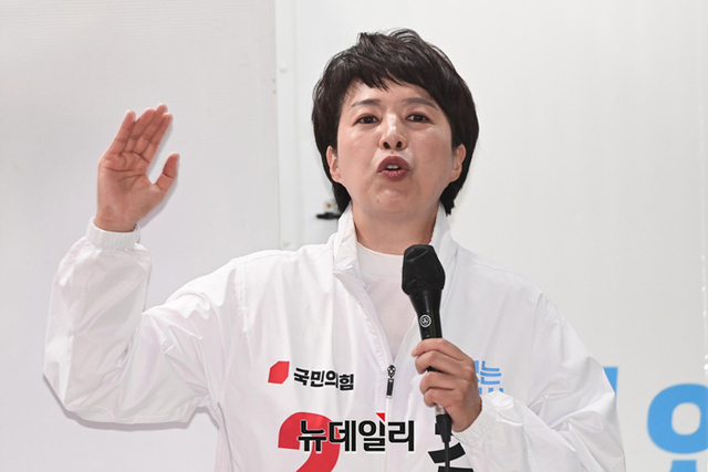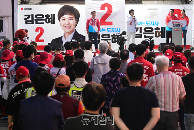 김은혜 국민의힘 경기지사 후보가 선거운동 마지막 주말인 29일 오후 경기 평택시 오산공군기지 정문에서 열린 유세에서 지지호소를 하고 있다. (경기 안양=강민석 기자)