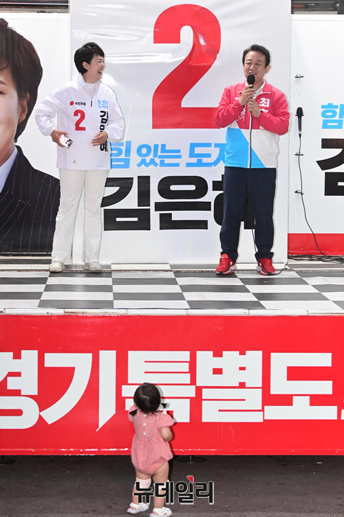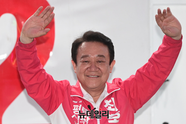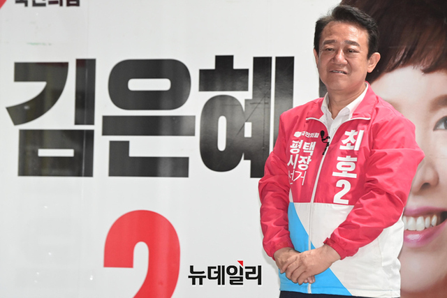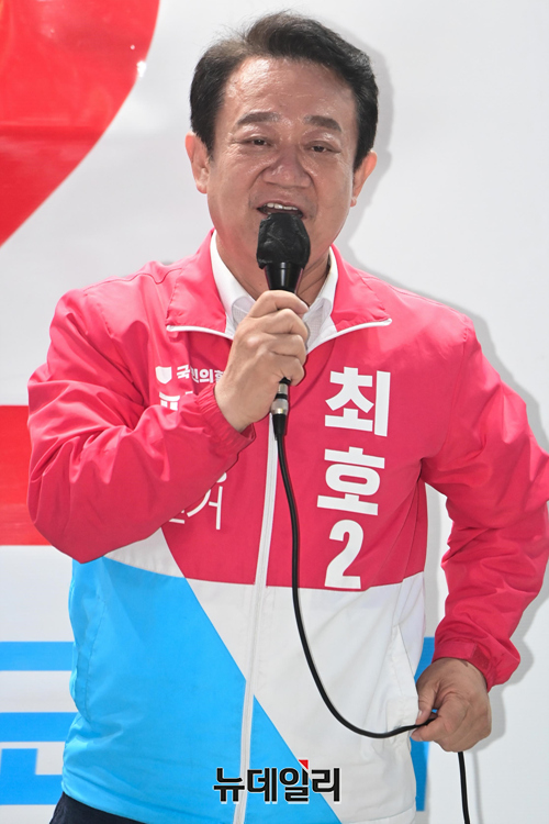 최호 국민의힘 평택시장 후보가 29일 오후 선거운동 마지막 주말인 29일 오후 경기 평택시 오산공군기지 정문에서 열린 합동유세에서 지지호소를 하고 있다. (경기 평택=강민석 기자)