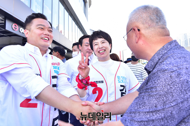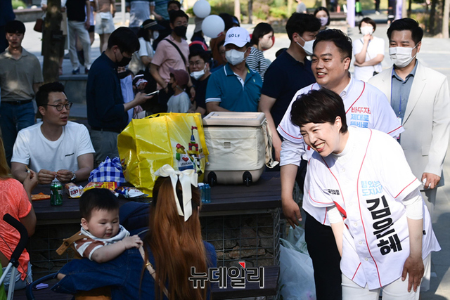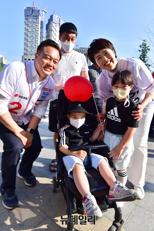김은혜 국민의힘 경기지사 후보와 구혁모 화성시장 후보가 선거운동 마지막 주말인 29일 오후 경기 화성시 동탄호수공원을 찾아 시민들과 기념촬영을 하고 있다. (경기 화성=강민석 기자)