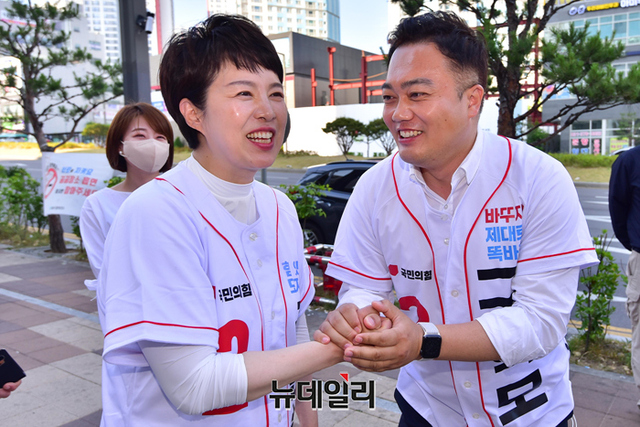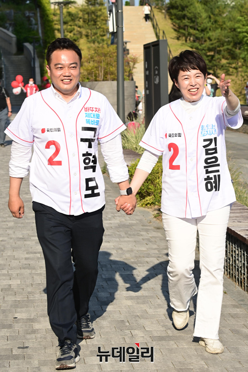 김은혜 국민의힘 경기지사 후보와 구혁모 화성시장 후보가 선거운동 마지막 주말인 29일 오후 경기 화성시 동탄호수공원에서 손을 잡고 이동하고 있다. (경기 화성=강민석 기자)