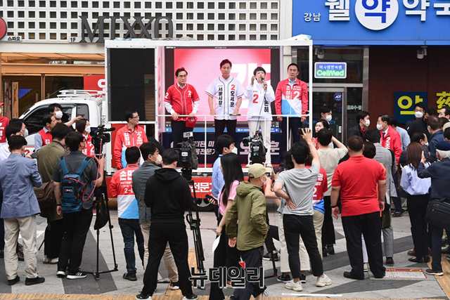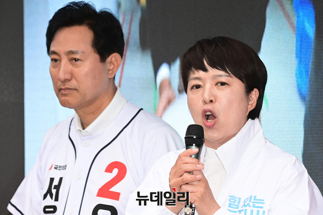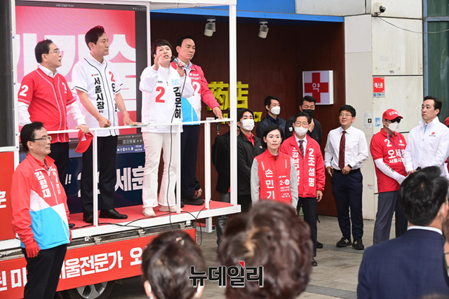 출근인사엔 오세훈 서울시장 후보, 김은혜 경기지사 후보, 조성명 강남구청장 후보, 태영호 의원이 참석했다.