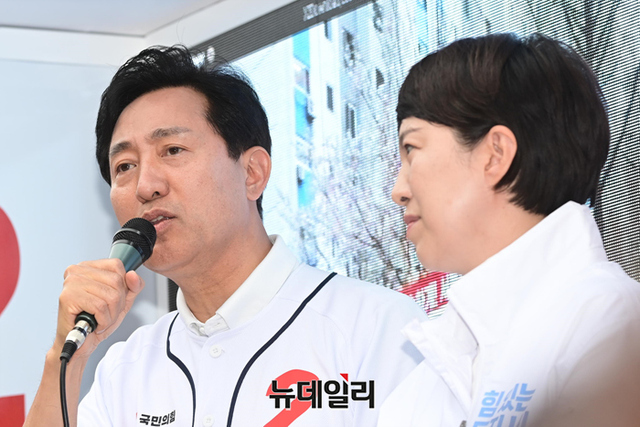출근인사엔 오세훈 서울시장 후보, 김은혜 경기지사 후보, 조성명 강남구청장 후보, 태영호 의원이 참석했다.