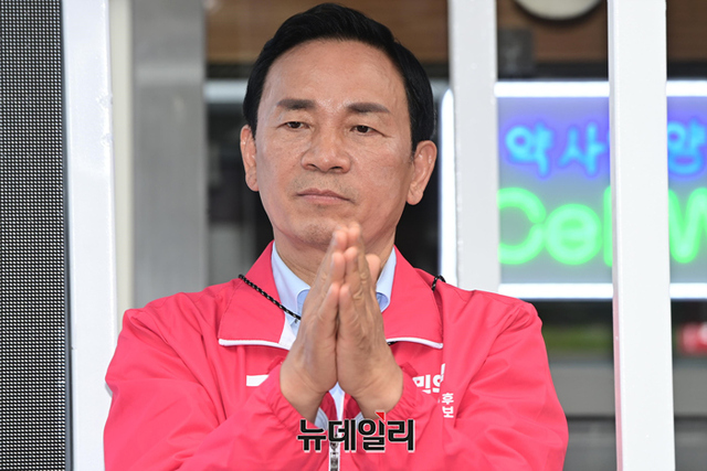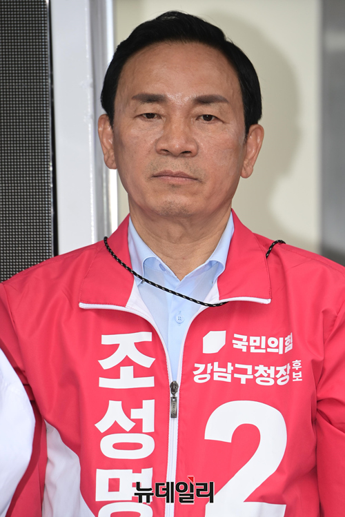 조성명 국민의힘 강남구청장 후보가 6·1 지방선거 본투표를 이틀 앞두고 있는 30일 오전 서울 강남구 강남역에서 시민들에게 출근인사를 하고 있다.