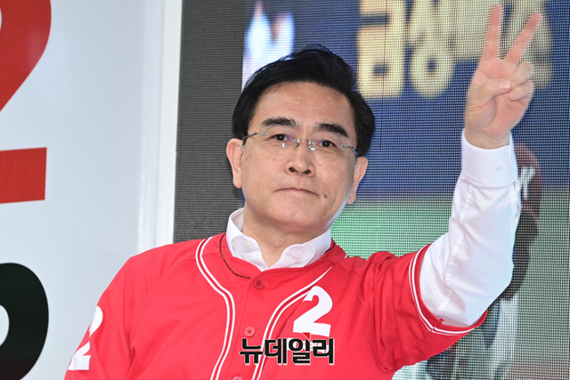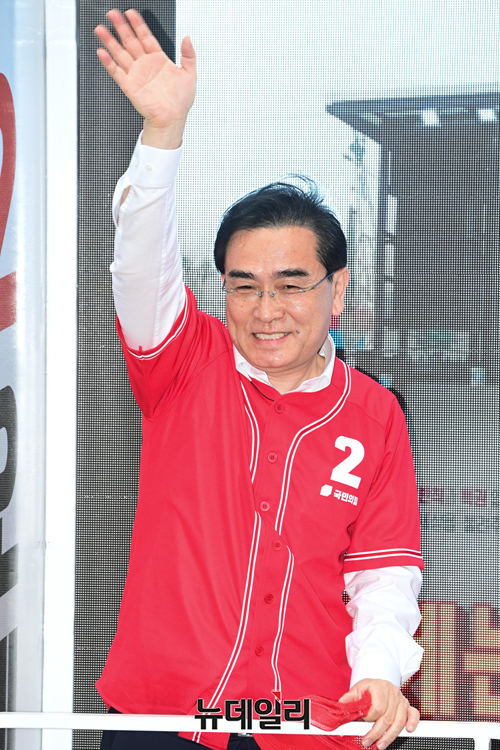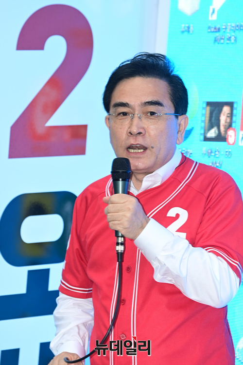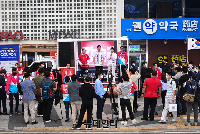 태영호 국민의힘 의원이 6·1 지방선거 본투표를 이틀 앞두고 있는 30일 오전 서울 강남구 강남역에서 출근길하는 시민에게 지지호소하는 랩을 선보이고 있다.