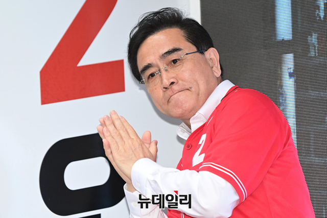 출근인사엔 오세훈 서울시장 후보, 김은혜 경기지사 후보, 조성명 강남구청장 후보, 태영호 의원이 참석했다.