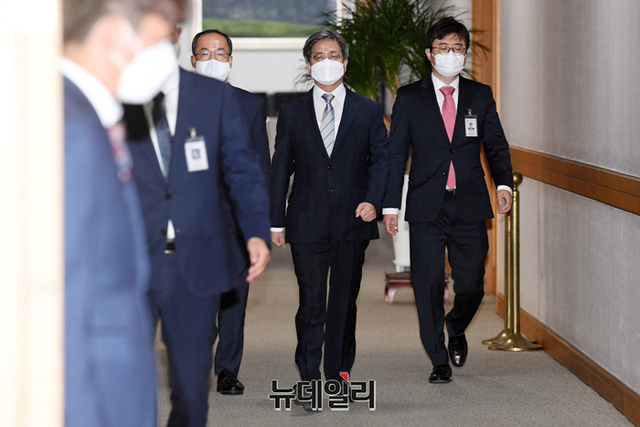 김명수 대법원장이 30일 오전 서울 서초구 대법원 대접견실에서 한동훈 법무부 장관을 접견하기 위해 이동하고 있다. (사진=공동취재단)
