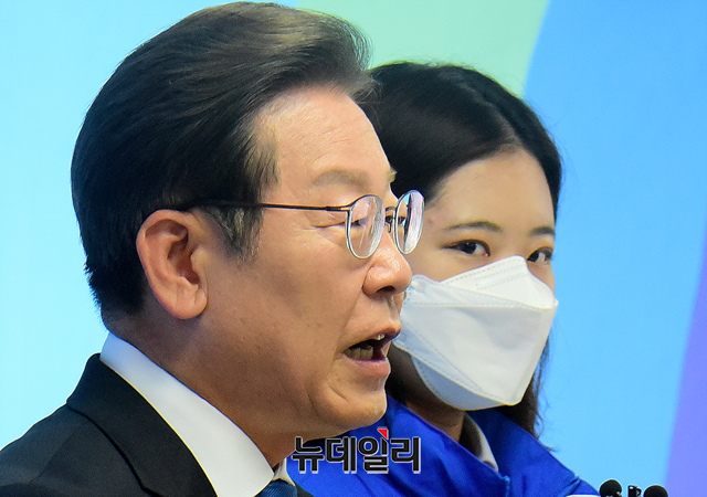 이재명 더불어민주당 총괄선대위원장이 30일 오전 인천 계양구 이 후보 캠프사무실에서 열린 과 윤호중·박지현 공동상임선대위원장과의 합동 기자회견에서 발언을 하고 있다.