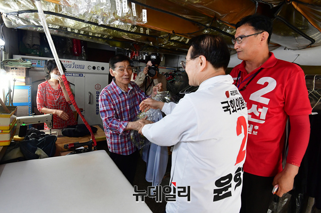 윤형선 국민의힘 계양을 국회의원 후보가 30일 오전 인천 경인교육대학교 주변 상인들에게 지지를 호소하고 있다.