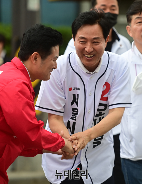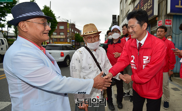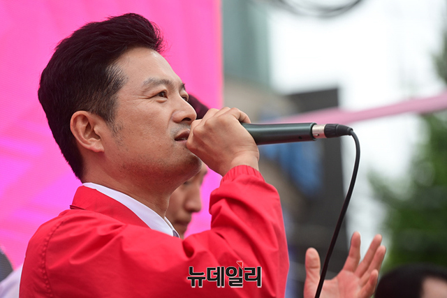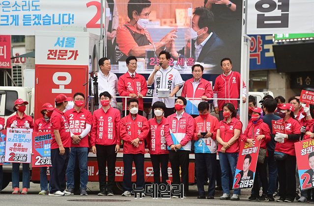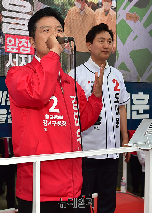 김태우 강서구청장 후보가 30일 오후 서울 강서구 방화사거리에서 열린 유세에서 지지호소를 하고 있다.