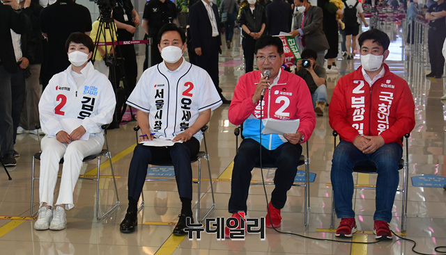 김은혜 국민의힘 경기도지사 후보, 오세훈 서울시장 후보, 허향진 제주도지사 후보, 부상일 제주을 국회의원 후보가 30일 오후 서울 강서구 김포공항 국내선 청사에서 김포공항 이전 저지를 위한 공동 기자회견을 하고 있다.