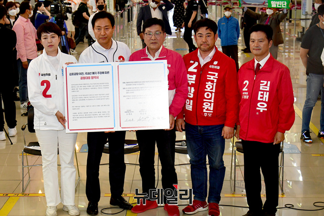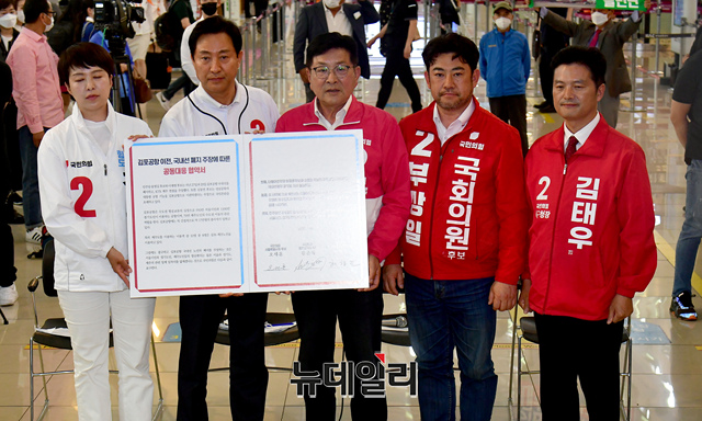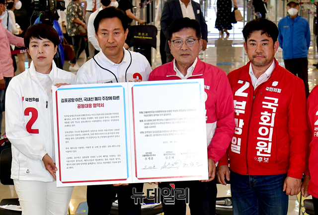 김은혜 국민의힘 경기도지사 후보, 오세훈 서울시장 후보, 허향진 제주도지사 후보, 부상일 제주을 국회의원 후보가 30일 오후 서울 강서구 김포공항 국내선 청사에서 김포공항 이전 저지를 위한 공동 기자회견에서 협약서를 들어 보이고 있다.
