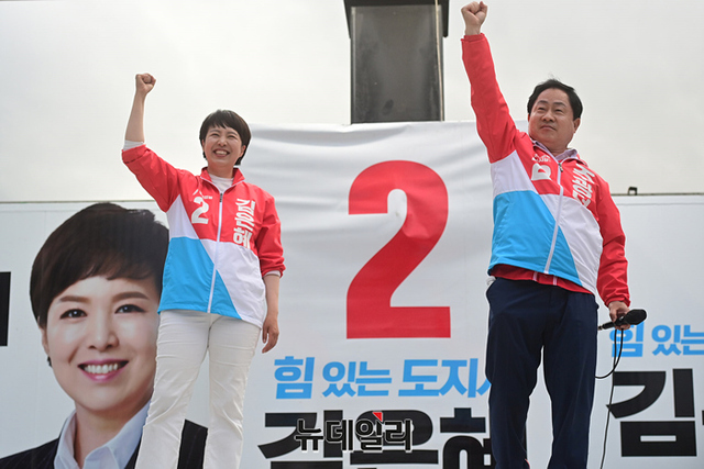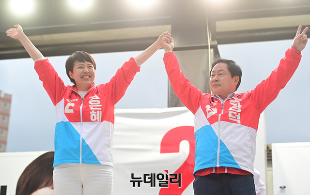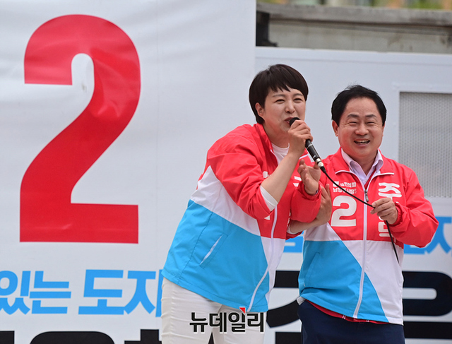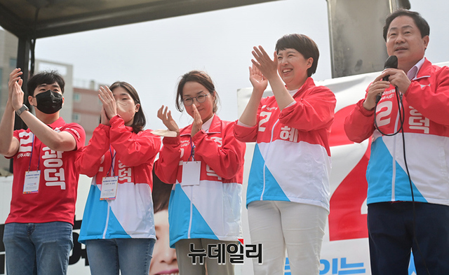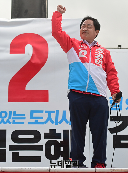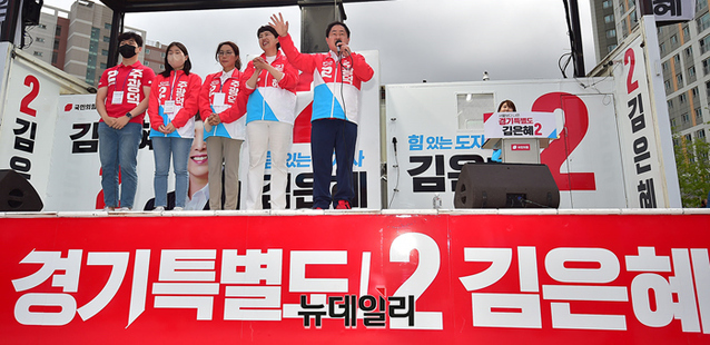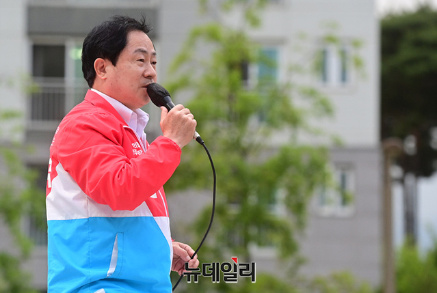 주광덕 국민의힘 남양주시장 후보가 30일 오후 경기 남양주시 다산동 수변공원에서 열린 유세에서 지지호소를 하고 있다. (경기 남양주=정상윤 기자)